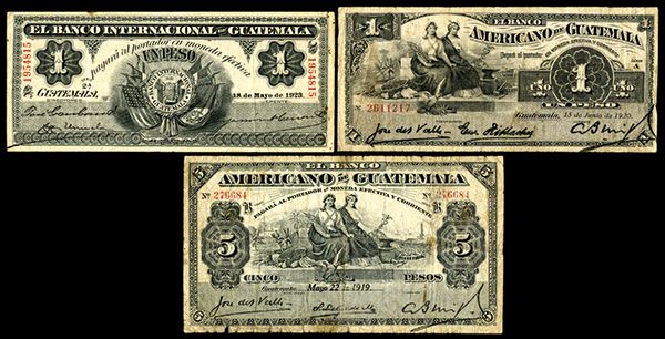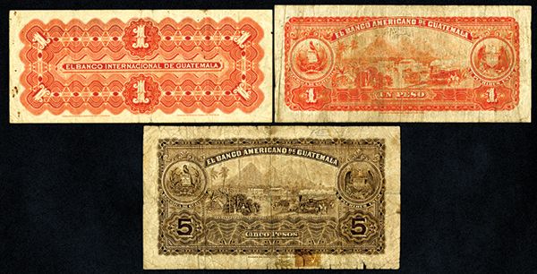 Banco Americano & Banco Internacional de Guatemala, 1919-23, Trio of Issued Banknotes Guatemala, lot of 3, includes from Banco Internacional de Guatemala, 1 Peso, 1923, S-153b, VF, IBNC; from Banco Americano de Guatemala, 1 Peso, 1920, P-S111b, ABNC, Fine; and 5 Pesos, 1919, P-S117a, VG, W&S.