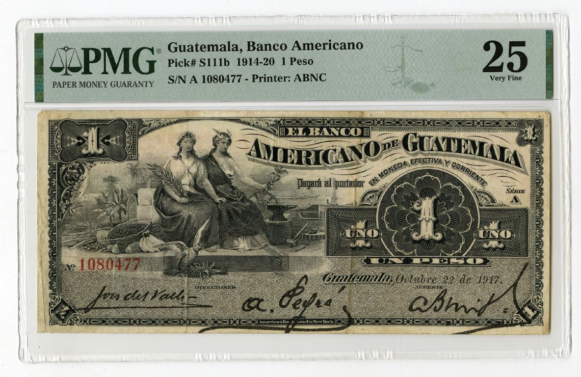 Guatemala, 1914. 1 Peso, P-S111b, Issued Banknote, Black printing with pair of seated allegorical women at left, Back is orange with scene of three mountains looking over village at center, S/N A 1080477, PMG graded Very Fine 25, ABNC.