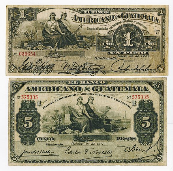 Guatemala. Lot includes 1 Peso, 1923, P-S116, Choice Fine, W and 5 Pesos, 1917, P-S112b, Fine, ABNC.