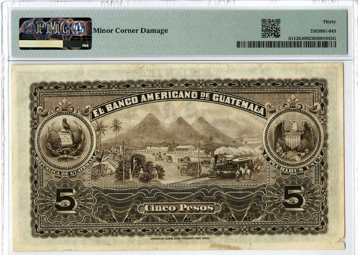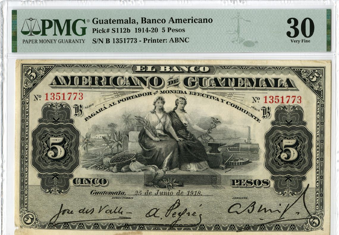 Guatemala, June 25, 1918. 5 Pesos, P-S112b, Issued Banknote, Black with two Allegorical women seated at center, Back is brown with three mountains over town at center, S/N B 1351773, PMG graded Very Fine 30 with comment "Minor Corner Damage," ABNC.