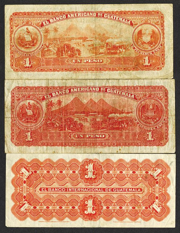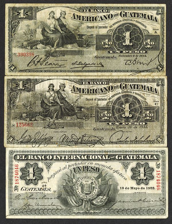 Guatemala. Banco Americano. 1 Peso. P-S111b (2). 2.11.1914; 26.1.1923. Fine, the earlier a bit darker; Banco Internacional. 1 Peso. S153b. 18.5.1923. Last date of the type. Very Fine or so. 3 pieces.