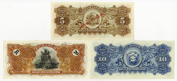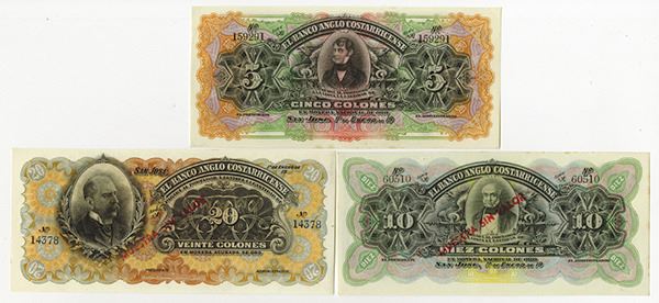 Costa Rica. Includes SPECIMEN 5, 10, and 20 Colones, 1.1.19xx, P-S122s3, PS-123s3, P-S124s3. Overprinted "MUESTRA SIN VALOR" in red on all. BWC. About Uncirculated.