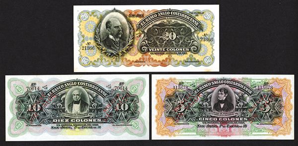 Costa Rica. 5, 10, 20 Colones. P-S122s; S123s; S124s. Bold designs with colorful underprints. All overprinted in red: MUESTRA / SIN VALOR twice on either front or back. Uncirculated, staple hole on top corner as often seen. Paper tone on some. 3 pieces.
