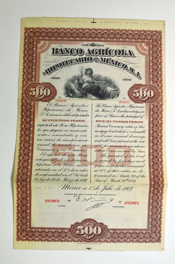 Mexico. 500 Pesos Coupon Bond Specimen. ABNC. Very Fine, edge tone.