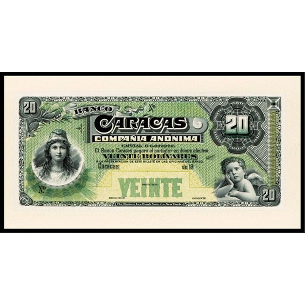 Caracas, Venezuela, 19xx (1926--28), 20 Bolivares, P-S157, Unlisted proof, India on large card, Black on light green, Liberty at left and cherub on right, no back included, Gem uncirculated condition. Rare note that is unpriced in SCWPM. ABNC.