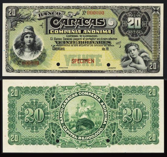 Caracas, Venezuela, 20 Bolivares, Ser.J, P-S158, Unlisted Specimen, Black on green and yellow underprint, cherub on lower right and allegorical ÒLibertyÓ facing forward on left, back green with arms of bank in center, Red Specimen overprints, POC's and Ò00000Ó serial numbers, PMG graded Superb Gem Unc 67 EPQ, Unpriced in SCWPM. Extremely rare note that is rarely seen in any form and has rarely come to auction, this note will be hard to improve upon. ABNC.
