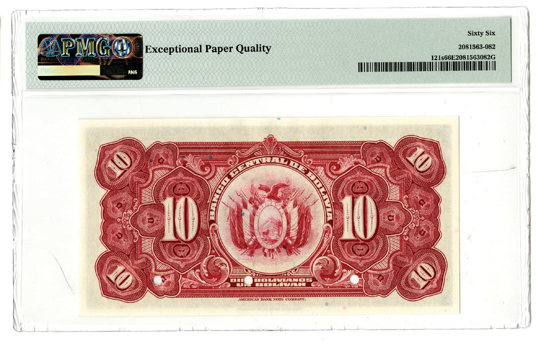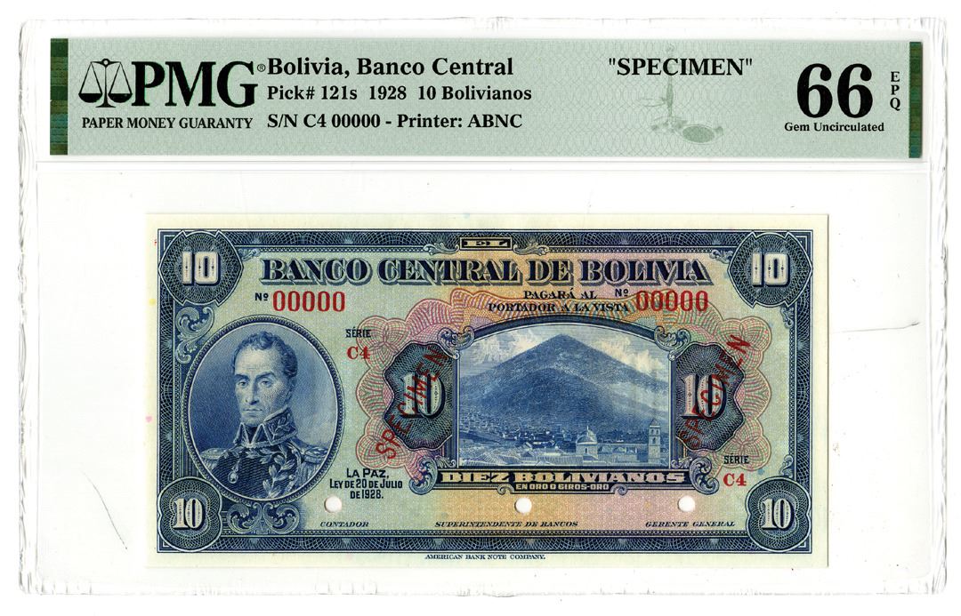 Bolivia. 1928. 10 Bolivianos, P-121s, Specimen banknote, Blue on m/c, Series C4, Back red, Specimen overprints, POC's, PMG graded Gem Uncirculated 66 EPQ. ABNC.