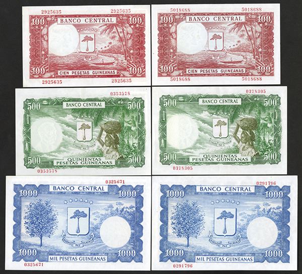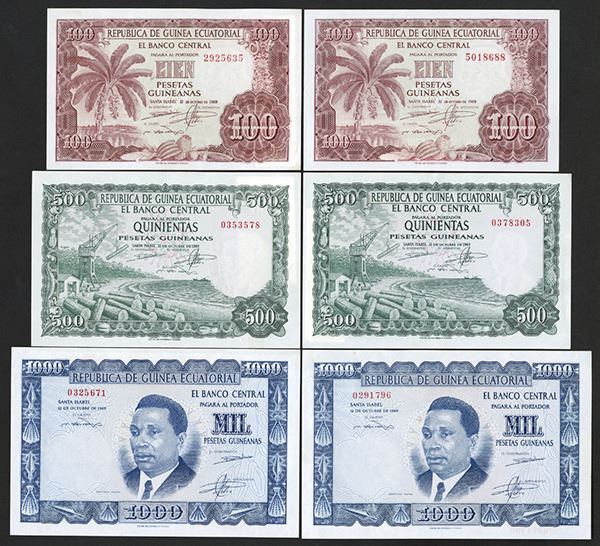 Equatorial Guinea. 100, 500, 1000 Pesetas. P-1, 2, 3. Well matched group of large format notes. Choice About Uncirculated to Gem Uncirculated. 2 notes of each type for a total of 6 pieces.