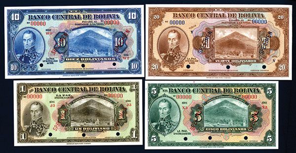 Bolivia, 1928, Lot of 4 notes, Includes 1 Bolivianos, P-118s; 5 Bolivianos, P-120s; 10 Bolivianos, P-121s; and 20 Bolivianos, P-122s, All are Choice to Gem Uncirculated, All with portrait of Simon Bolivar on left with city scenes in middle. ABNC.