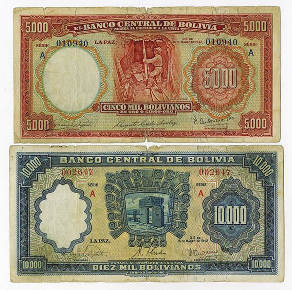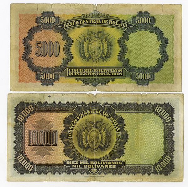 Bolivia. Lot of 2 notes, Includes 5000 Bolivianos, P-136, Fine and 10,000 Bolivianos, P-137fine to VF with small edge faults. Attractive pair of notes. W&S (2)