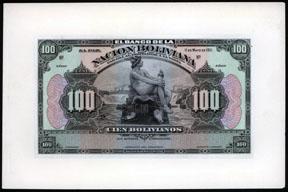La Paz. Old Date 1911 (1929). 100 Bolivianos, P-117 Unlisted Proof without overprint. Black on m/c with seated Mercury in middle. Printed on india paper on large white card, no back proof included. This note does not have the oveprint "Banco Central De Bolivia" in the middle of the face but is the base note that it was overprinted on top of. Rare as proof and rarer without oveprint. ABNC.