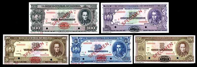 Bolivia, Lot of 5 Specimen notes, all appear Unc. to CU but were removed very carefully from a specimen book years ago and have very minute mounting traces on the back left or right borders, None are listed in the SCWPM as specimens, only as issued or remainders, Includes 5 Bolivianos, Series U, P-138s; 10 Bolivianos, Series A, P-139s; 20 Bolivianos, Series A, P-140s; 50 Bolivianos, Series F, P-141; 100 Bolivianos, Series A, P-142s, all have red Specimen overprints and oval TDLR Specimen ovals in the middle-bottom of the notes, very attractive and rare as specimens. TDLR.