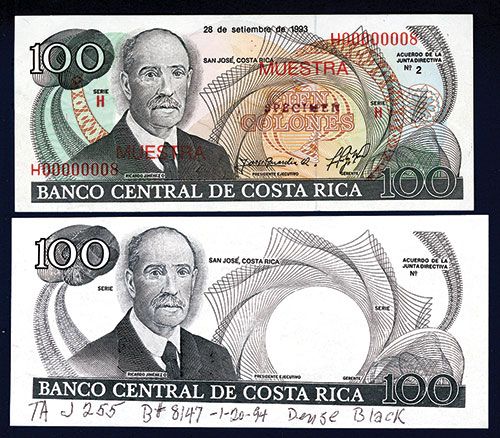Costa Rica, Lot of 2 different banknotes, 1 proof and 1 specimen. Includes Specimen, San Jose. 1993. 100 Colones, P-261s , S/N H00000008, AU-Unc. and A black and white proof without underprint of the face that can be from the 1988 or 1993 issue, with archival notations on bottom TA J255 B#8147 -1-20-94 Dense Black. ABNC.
