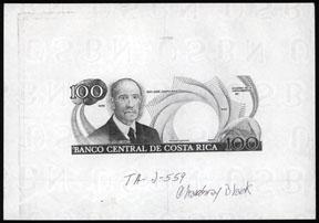 San Jose, Costa Rica. ND (ca.1988, 1989). 100 Colones, P-254 Unlisted Large Die Proof printed on white paper in black with no underprint with portrait of Ricardo Jimenez O., back blank. Bottom has written in large margin "TA-J-559, Chardonay Black" with [late #113709" on top. Uncirculated condition. ABNC.
