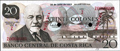 San Jose. Costa Rica. 1983, Series Z. P-252 Unlisted. 20 Colones Tyvek banknote. Red "00000" serial numbers, "Muestra" overprint and punched out cancels. Un-watermarked paper. Unlisted as specimen banknote. Choice Unc. Rare Tyvek item. ABNC.