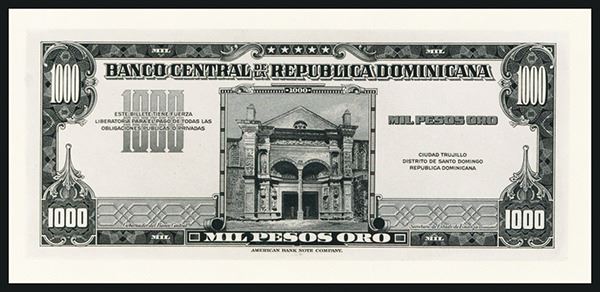 Santo Domingo, Dominican Republic. ND (ca.1947-50), 1000 Pesos Oro, P-67 Unlisted Face Proof, no back proof. Printed on india paper mounted on large card, Black with no underprint, seals or serial numbers, Basilica Menor de Santa Maria in middle. Choice to Gem Uncirculated condition, POC's. Rare note that is unpriced in SCWPM as issued and is rarely seen in any form. ABNC.