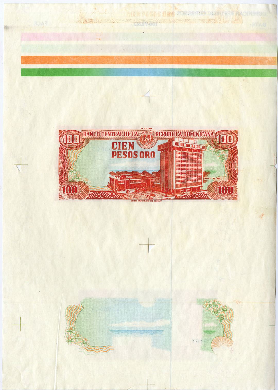 Dominican Republic. 1988. P-128 Unlisted Essay. 100 Pesos Oro Compound specimen/proof essay of complete 100 Pesos note with face and back on top and a specimen of the undertint of the face and back beneath it. Color registration bars are on top. Printed on banknote paper with security threads. Black S/N A00000F. Uncancelled. Interesting and unique format. Choice Unc. condition. USBNC.