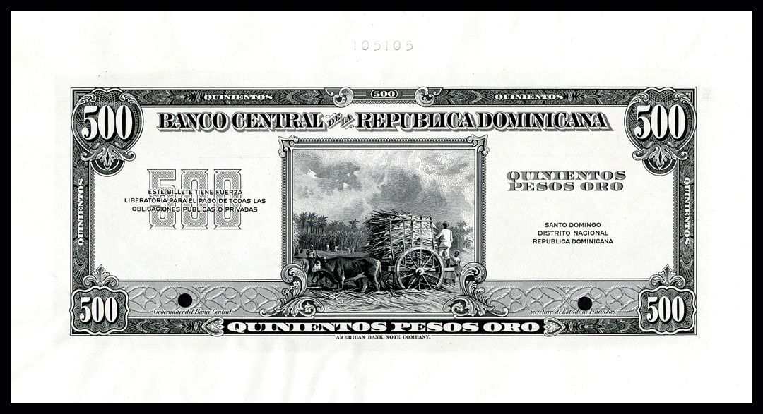 Santo Domingo, Dominican Republic. ND (ca.1947-50), 500 Pesos Oro, P- Unlisted Essay Face design with oxen pulling wagon of sugar cane instead of image of the "Obelisco" for the 1947 ND Issue, no Back Proof. Printed on india paper mounted on large card, Black with no underprint, seals or serial numbers, Text on right beneath denomination is "Santo Domingo - Distrito Nacional - Republica Dominicana" which does not match any issue, either the 1947 ND Issue or the 1956 ND issue. Text on lower right reads "Secretario De Estado De Finanzas" which matches the 1956 ND Issue. Choice to Gem Uncirculated condition. Plate # 105105 on top of excess margin. Evidently a transition design essay that was never used. Very possibly unique and the first time seen by this cataloger. ABNC.