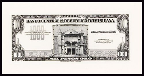 Dominican Republic, ND (1947-50), 1000 Pesos Oro, P-67p Unlisted face front proof with no back, Printed in Black without underprint or seal, Basilica Menor de Santa Maria in center, Light POC's that have not fallen out. Gem uncirculated, rare and attractive note that is unpriced in SCWPM. ABNC.