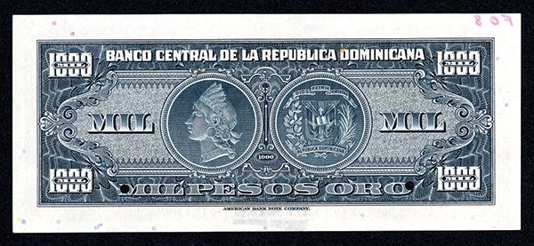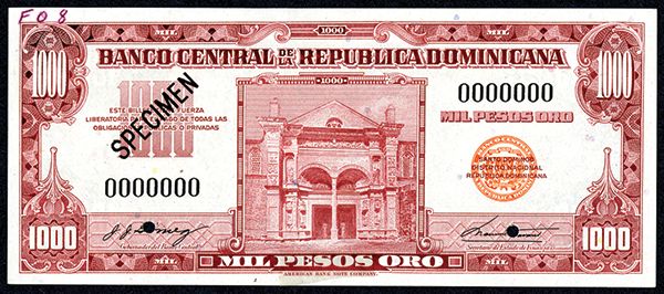Banco Central De La Republica Dominicana, ND (1962) Specimen Banknote. Dominican Republic. ND (ca.1962) ABNC Issue, 1000 Pesos Oro, P-98s Specimen banknote, Choice Uncirculated condition but there is an archival ink notation on the top left corner, attractive note. ABNC. Another rare note in any format or condition. It is listed as unique issued.