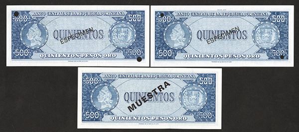 Dominican Republic, Lot of 3 notes, All have different Suffix-Prefix-signature combinations. All are 500 Pesos Oro Specimen notes, Dark blue on m/c, Columbus Tomb and Cathedral at center, back blue with Medallic Liberty at left and arms at right, overprinted Muestra or Especimen on face and back, Includes 2 examples of P-105s; and 1 examples of 1975, P-114s, All are in Choice to Gem Uncirculated condition. Scarce and difficult signature and suffix-prefix type set collection to put together. P-105 catalogs for $1200 issued in SCWPM. TDLR.