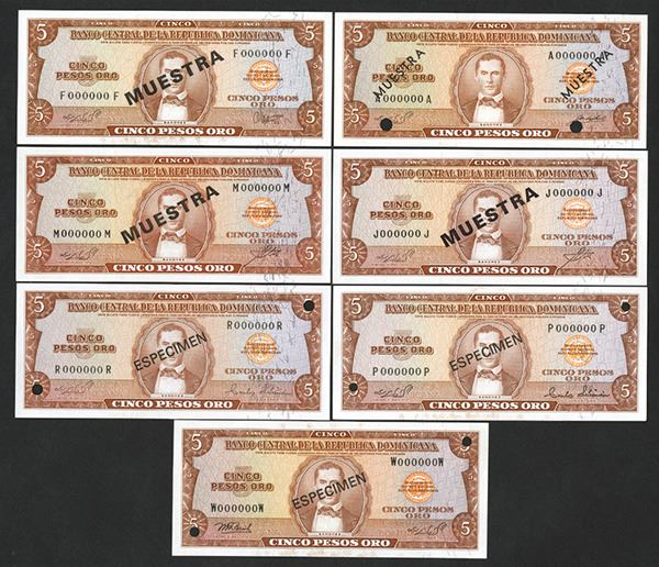 Dominican Republic, Lot of 7 notes, All have different Suffix-Prefix combinations and most with different signatures or signature combinations. All are 5 Pesos Oro Specimen notes, Brown on m/c, Portrait of J. Sanchez at center, back brown with Medallic Liberty at left and arms at right, overprinted Muestra on face and Especimen on back, Includes 6 examples of P-100s; and one example of 1976 dated P-109s, All are in Choice to Gem Uncirculated condition. Scarce and difficult signature and suffix-prefix type set collection to put together now. TDLR.