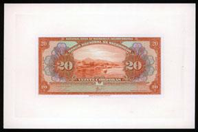 1939. 20 Cordobas, P-67b Unlisted proof face with no back, orange on m/c with Bay and port Corinto in middle. Printed on india paper on large card, CU condition. Scarce note in any condition. Catalogs $300 in Fine condition. ABNC.