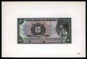 1951. 10 Cordobas, P-94c Unlisted proof face with no back, brown on m/c with Liberty on right. Printed on india paper on large card, CU condition. Scarce note and unlisted as proof. ABNC.