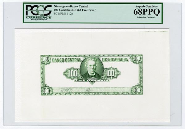 Nicaragua. 1962, 100 Cordobas, P-112p Color Trial, Printed in green instead of issued red-brown, Printed on large margined card, PCGS graded Superb Gem Uncirculated 68 PPQ.