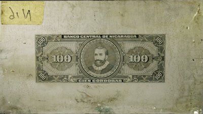 Nicaragua. Banco Central De Nicaragua Unique Printing Plate. 1962. P-112 Unlisted. 100 Cordobas. Back plate only. Vignette of back with Francisco Hernandez de Cordoba. 9 by 5 inches. No plate numbers on plates. XF condition. Extremely rare Nicaragua Numismatic items. Unique in archive. ABNC