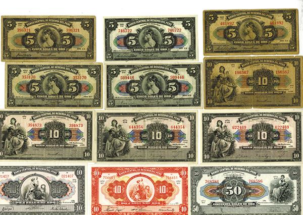Peru, Lot of 12 notes, Includes 5 Soles (5 different), P66a. 1936-1939, and 1941, P-66Aa, ABNC; 1953 and 1956 issues, 10 Soles, 1953, P-71a, TDLR and 1956, P-77, G&D printing; 1936 to 1941, 10 Soles, (4 examples) ABN printing, P-67 and P-67Aa; and 1950, 50 Soles, P-68Aa, Issued, XF, ABNC; Condition varies between VG and CU. Inspection recommended. Sold "As is", returns not accepted.