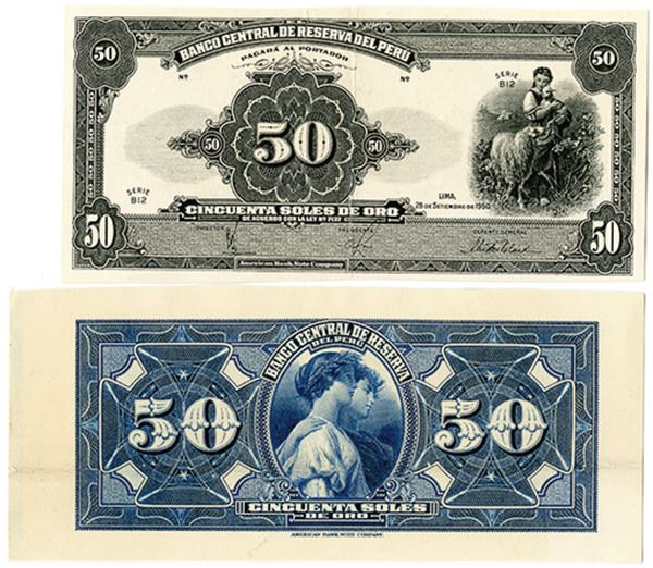 Peru. 9-28-50, 50 Soles, P-68A Unlisted Proof, F&B Proofs printed on thin card cut down to banknote size. The face is a Progress proof without undertint. Both are in AU condition with both having one light fold keeping them from Uncirculated. ABNC. Rare as proofs.