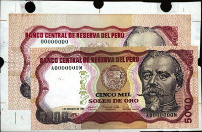Peru. Banco Central De Reserva Del Peru. ca.1981-82. P-123 Unlisted. 5,000 Soles. 4 different specimen, proof and progess proof banknotes and vignettes. 1). P-123 Unlisted specimen banknote. Choice uncirculated; 2). Proof vignette of Francisco Bolognesi; 3). Progress back proof with vignette and text with no undertint; 4). P-123 Color Trial. Unlisted banknote. Printed from an individual plate with large margins that are not cut down to banknote size. Tape remnants on top registration holes. Handling on right side of note with internal folds and bends. Appears AU. Colors are lighter on this note and the undertints are slightly different. Rare specimen/proof. Interesting and rare collection of archival production material relating to the design of this note. ABNC.