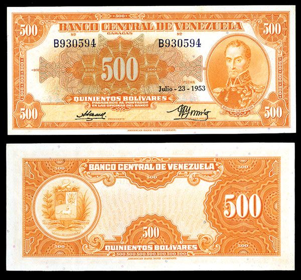 Venezuela, July 23, 1958, 500 Bolivares, P-37b, Issued banknote, Orange and m/c, PMG graded Choice Extremely Fine 45, EPQ, a superior example for the grade that gives the appearance of an AU-Unc. note at first glance. ABNC. Only 8 graded by PMG and only 3 graded higher.