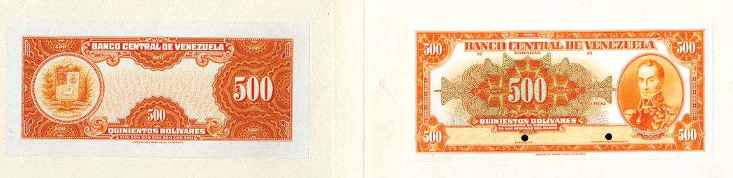 Venezuela, ND, 500 Bolivares, P-37p, Proof face and back printed on india paper on large card, Orange and m/c, Gem Uncirculated. ABNC.