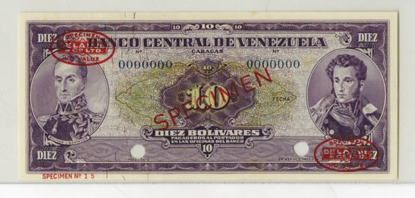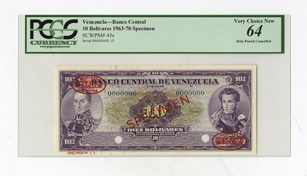 Venezuela. 1963-70, 10 Bolivares, P-45s Unlisted Specimen Banknote in SCWPM with Specimen and Oval TDLR overprints on top left and lower right corners, Minor Mounting remnants on back right margin that is difficult to view. PCGS graded Very Choice New 64, POC TDLR.