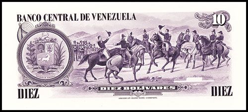 Venezuela, 1980, 10 Bolivares, P-57, Unlisted Progress Proof of partially engraved back with officers on horseback center right, printed in purple and mostly completely engraved but missing title on lower right, Printed on india paper on large white card. Bottom right has “10-2-80” date with no plate number. Uncirculated. ABNC. Rare Venezuela banknote production material. ABNC.