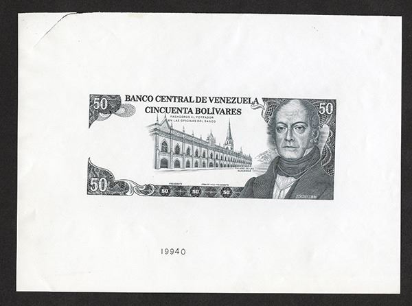 Venezuela, ND (ca.1981-1990), 50 Bolivares, Similar to P-65 and P-72, both printed by BDDK (not ABNC), Gray-black face on glossy white paper with Bello on face to the right, large margins without underprints, S/N's, watermarks or seals. Choice Uncirculated, Plate # 19940 on bottom. Rare Archival proof from a proposed issue that was printed by another printer and not ABNC.