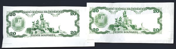 Lot of 2 notes. Both are ND (ca. 1987), 20 Pesos, P-64A Uniface back printed in green of Unlisted Specimen paper essay, One is printed on "Ambano" paper with no visible security features, Unwatermarked, AU with large margin on right and bottom and the second printed on "Security" paper with multi-color threads on face and back with a security strip toward left center of note. Unwatermarked. ABNC (no imprint). Rare essay paper proofs.