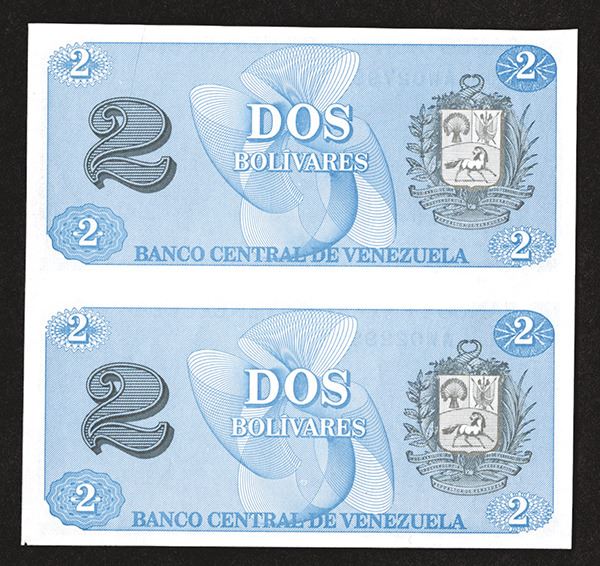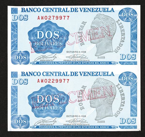 Venezuela, 1989. P-69 Unlisted. 2 Bolivares Essay specimen pair. Bolivar's portrait is on right as well as signatures, text and date. Printed on "Unknown" paper (it was unmarked). This banknote was utilized for paper testing and evaluation to compare Crane, Dotmar and this unlabeled paper. All have red serial numbers and red specimen overprints. Backs are printed fully. No cancellation holes. Rare banknote research specimen pair from USBNC. Unc. to CU Condition. USBNC.