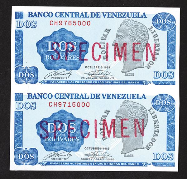 Venezuela, 1989. P-69 Unlisted. 2 Bolivares Essay vertical specimen pair. Bolivar's portrait is on right as well as signatures, text and date. Printed on "Domtar" paper. This banknote was utilized for paper testing and evaluation to compare Crane versus Dotmar paper. Both have red serial numbers and red specimen overprints. Backs are printed fully. No cancellation holes. Rare banknote research specimen pair from USBNC. Uncirculated to CU condition. USBNC. Includes copy of letter referring to the paper tests.