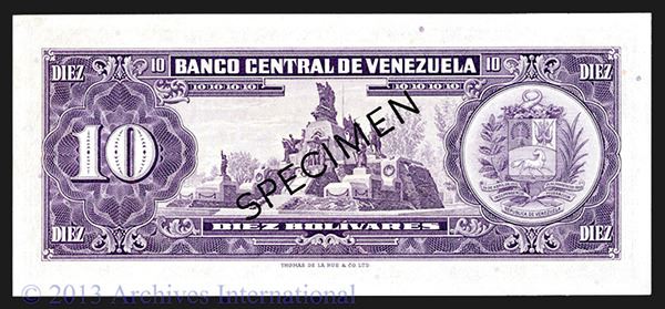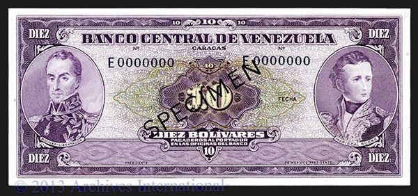 Venezuela, 10 Bolivares, P-38 Unlisted Specimen, Series E, Purple on m/c, Specimen overprints, Choice to Gem Uncirculated with excellent centering, Rare note in high grade and unlisted as specimen. TDLR.