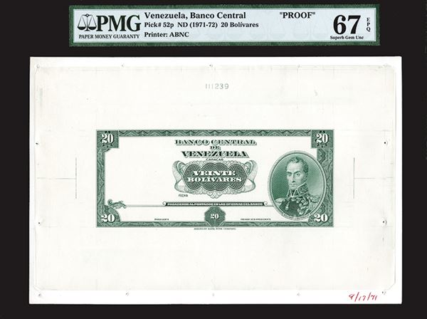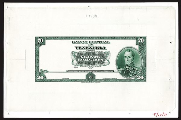 Venezuela, 1980, 20 Bolivares, P-52 Unlisted Progress, Proof of partially engraved face printed on india paper on large card. Complete border and text but missing undertints and lower engraved signature block areas. Dated on lower right "9/17/71". Printed on india paper on large white card. Plate # 11239. Unique proof found in the archive. Gem uncirculated. ABNC.