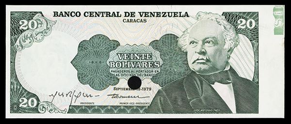 Venezuela, September 18, 1979, 20 Bolivares, P-53s Unlisted variety without serial numbers or specimen overprints. ABNC.