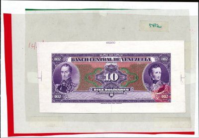 Venezuela. Banco Central De Venezuela Production Proofs. ca.1945-1980. P-31; P-51. 10 Bolivares 3 different production proof models or mockups. 2 of the notes have been cut to remove undertint area, than overlayed on clear plastic photo-proof of undertint or proof of undertint and mounted to card. 1 undertint note is mounted and printed on banknote paper. Another rare group of Venezuela currency production material. ABNC.