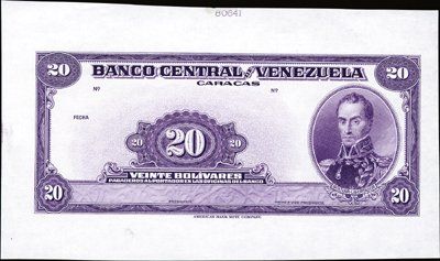 Caracas, Venezuela. Banco Central De Venezuela. 1940-52. P-32 Trial Color Unlisted. 100 Bolivares Proof Trial Color in purple. Printed on india paper with large margins. No undertint. Unlisted as Trial Color and unpriced in Pick. Very rare note. Choice Unc. condition with large margins. ABNC.