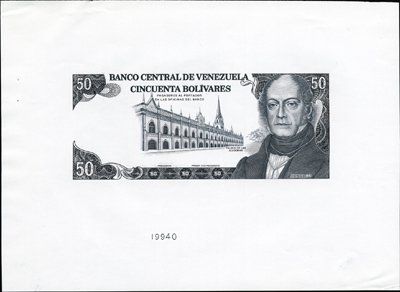 Venezuela. Banco Central De Venezuela.1990. P-65 Essay; P-72 TC. 50 Bolivares 2 different sets of proofs. 1). Essay proofs of P-65 of face and back cut down to banknote size, printed on white paper. Primitive quality due to photo engraving method utilized. This note was originally printed by BDDK and ABNC evidently utilized their original plate or photo of a plate to produce this note. 2). P-72, LDP's of face and back printed on glossy white paper. Choice Unc. Another interesting Venezuela assortment. ABNC.
