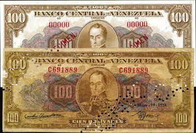 Caracas, Venezuela. Banco Central De Venezuela. 1940-52. P-34s. 100 Bolivares Specimen and spurious banknotes. 1). P-34s, Red specimen overprint, POC and "00000" serial numbers. Unc. 2). P-34 Counterfeit note. Punch Cancelled. Evidently was printed on 2 layers of paper and glued together. Well done but still evident it is a counterfeit. Dated 1951. Counterfeiting was taken very seriously by ABNC. Scarce pair. ABNC.