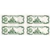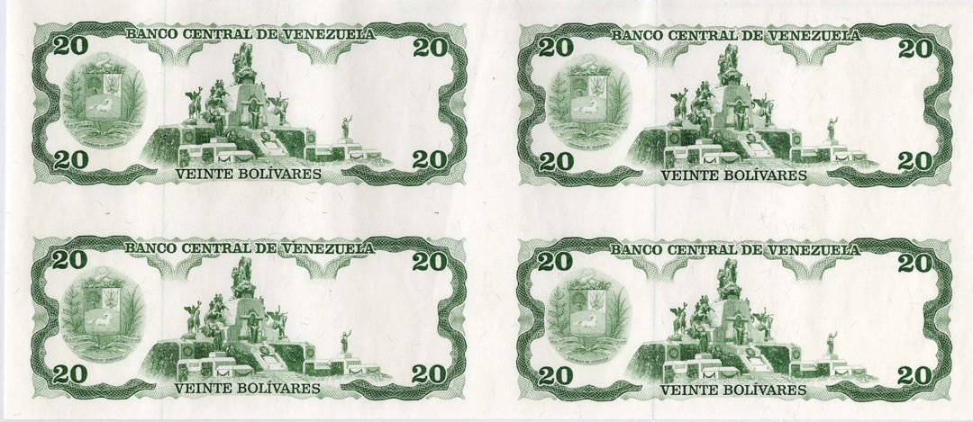 Venezuela, (ca.1974-84). Uncut block of 4 notes, 20 Bolivares, P-53 or P-63 Unlisted Proof Essay Back printed on white paper with multi-color silk security threads on back of each note and vertical security thread on the left 1/3rd of each note, no undertint. Uncirculated to CU condition. ABNC.