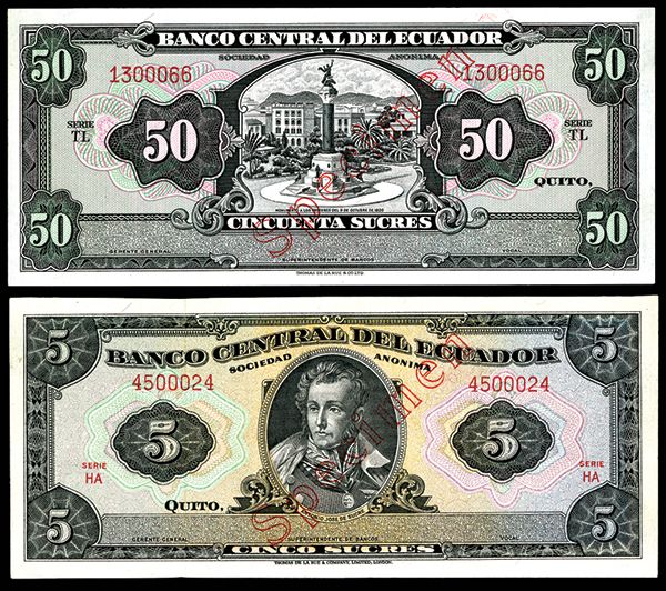 Banco Central Del Ecuador, 1966-1980 Specimen "TDLR" Banknote Pair. Ecuador. Lot of 2 Specimen notes, Includes 1958-88, 5 Sucres, either P-108 or P-113 Specimen, Normal serial numbers, no date or place listed, Security thread at left, Unc.; 1966, 100 Sucres, P-116s, overprinted Specimen, Normal serial numbers, Unc. to CU. TDLR.